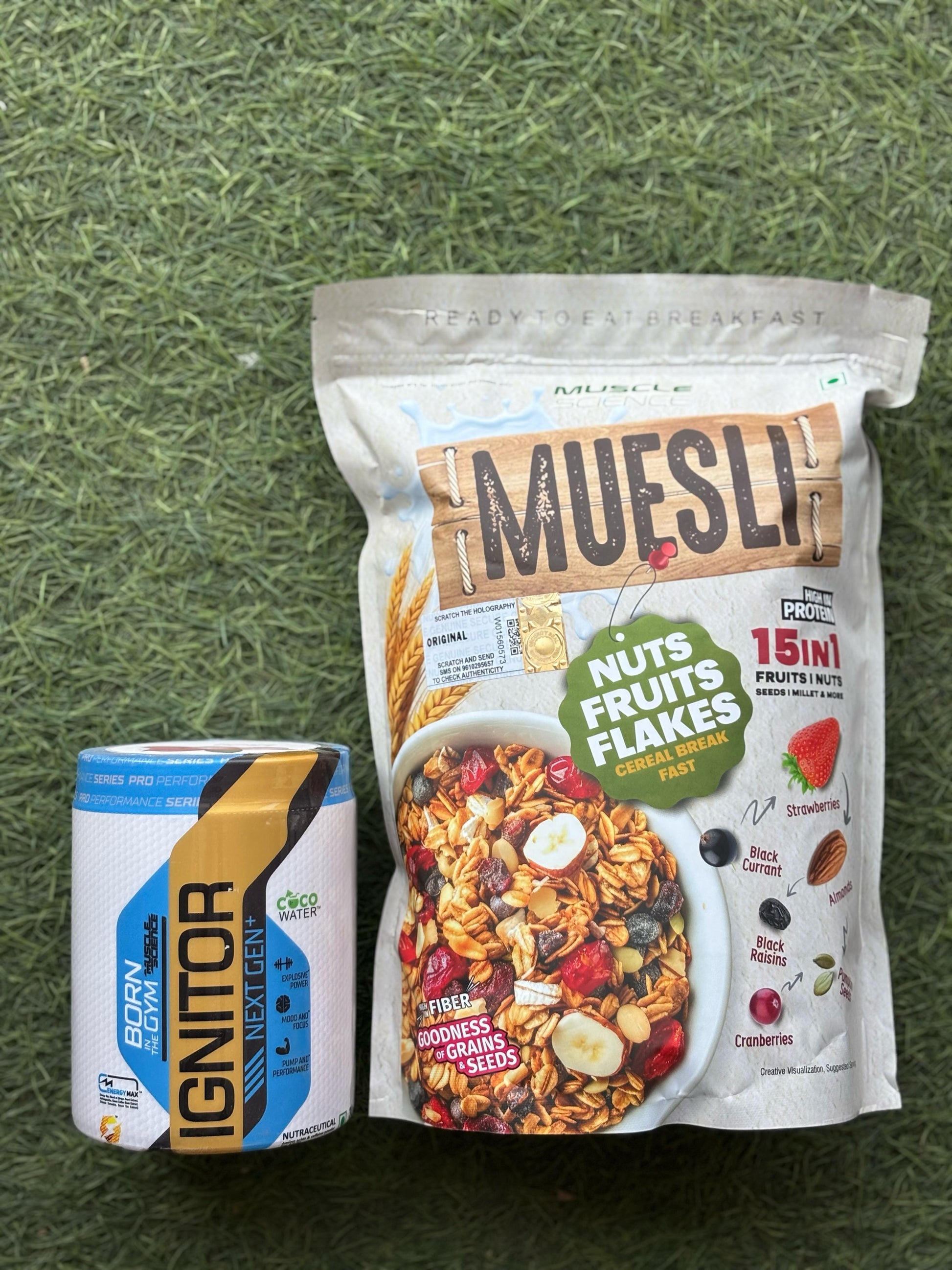 In this combo you get Muscle Science Ignitor NexGen Pre-Workout 240g and Muscle Science Muesli 750g